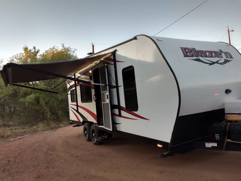 A 21-foot blazen toy hauler with full-size bathroom 2 queen size beds one dropping down from the ceiling and two twin size beds made out of couches frigerator microwave oven al 32 inch TV fully loaded with pots and pans ready for your camping trip