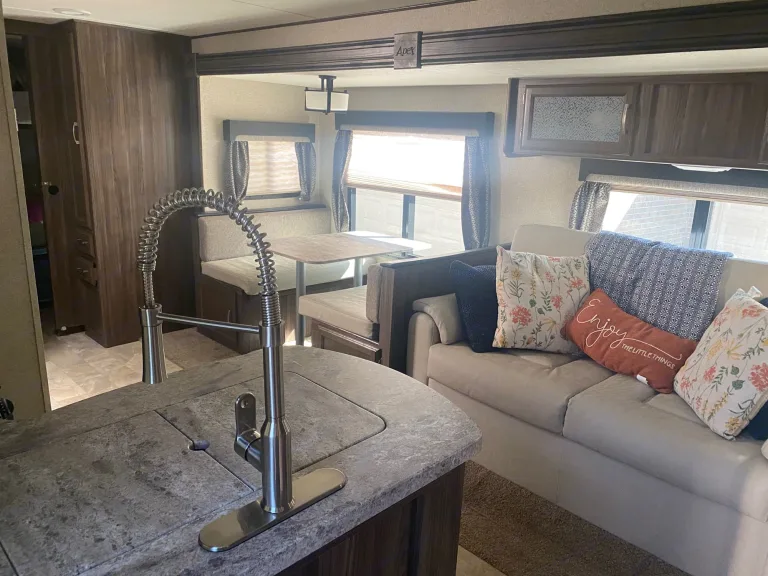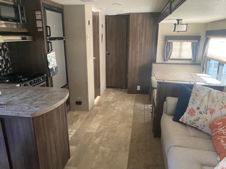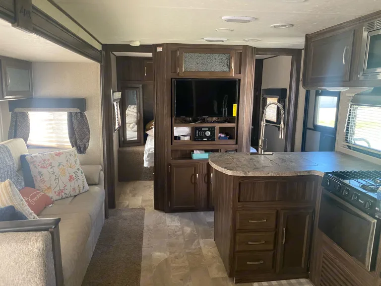 Perfect for families for quick or long getaways. This fully stocked trailer fits our family of 5 with plenty of space to invite friends and family (sleeps up to 11 if using the pull out couch bed and the dinette to bed conversion: https://www.youtube.com/watch?v=rX1lpA7XeD8). The living area is a slide out that extends the entire space and has a dining table that could be converted into a bad as well as a couch that pulls out to a queen sized bed. The TV in the living area is on a swivel, includes a Hdtv antenna, and can be turned to view from the master bedroom once the kids go to bed. The master suite offers a queen size bed that has sliding privacy doors. Charging outlet throughout the trailer for your phones and other electronics.