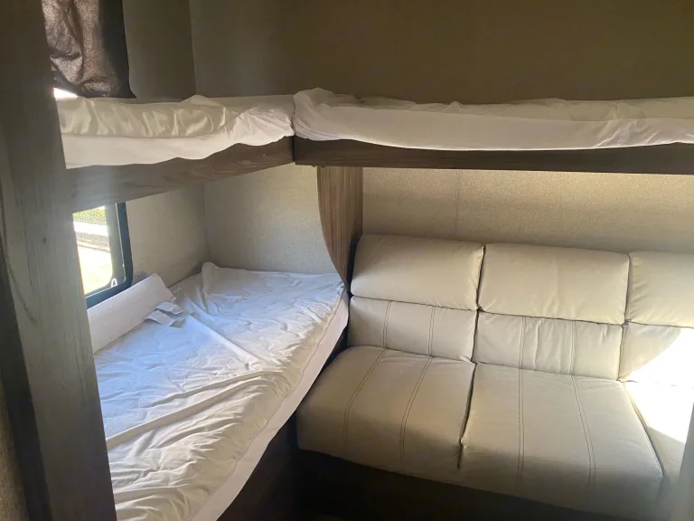 The kids bunk area includes three bunk beds and a futon couch that folds out into another bed. There is a TV in the bunkhouse as well as entertainment storage for DVDs and games. This Coachmen has 2 ACs to beat the Texas summer heat. All pots and pans will be provided, Keurig K-Cup coffee maker, and other kitchen accessories. Also included are 2 outdoor camping chairs with a 9x18 ft outdoor rug. Towels and sheets are also provided. You must provide your own pillows and extra blankets.