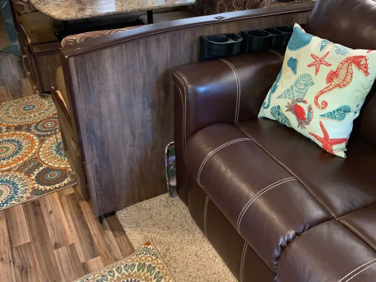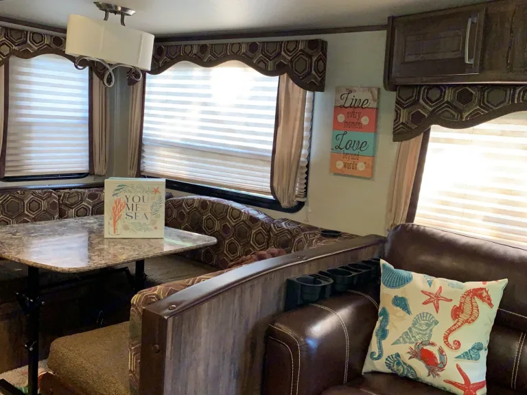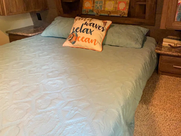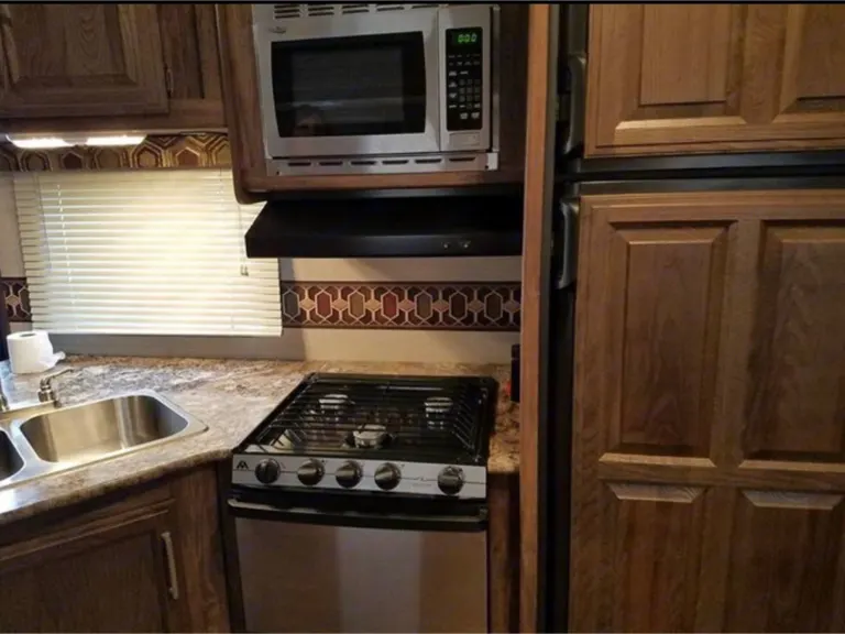 My camper is like a fully furnished 2 bedroom apartment complete with all bedding, towels, and stocked kitchen accessories including microwave, coffee maker, crockpot, toaster, and table top ice maker. This camper will sleep 6-8. For your outdoor comfort, I have a charcoal grill, 6 folding chairs, 5 ft table, small side table, huge rug, and fan as well as an outdoor kitchen with sink and gas stove. This 2 bedroom camper will comfortably sleep 4 adults(queen bed and 2 lower bunks)and 2 kids (on the top bunks- weight limit of 150 pounds for top bunks). The table converts to a bed and the living room sofa converts to a bed to accommodate 2-3 more. I deliver and set up for a fee depending on distance. I have a generator that may be rented for $50 a day.