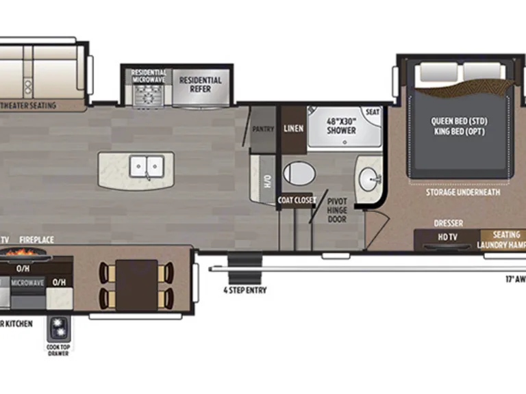 Well maintained 5th wheel. Has a king size bed with memory foam. Residential fridge. Fire place. TV in living room and bed room. Full shower, spacious enough for two people to fit in. Outdoor kitchen. Large awning.