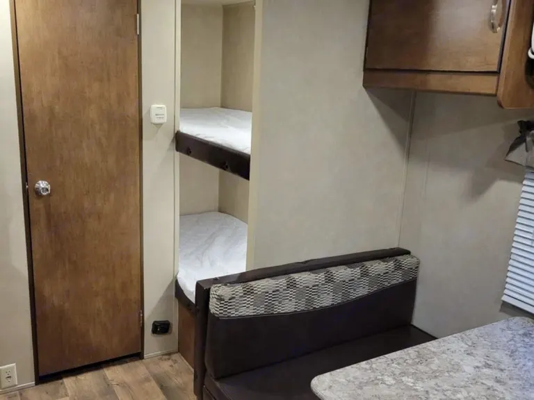 Bunk house travel trailer. Very clean with new tires. Easy hauling camper. Features everything you need with private bathroom, bath tub, stove top and sink and large pantry. We also leave in all cooking utensils needed to make the trip even easier for you! Great for a family camping trip. What's includedpots, pans