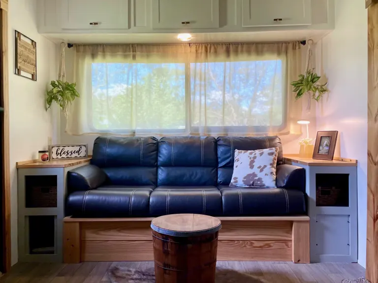 The living room area includes two comfortable glider recliners and a cozy couch. It has a smart tv to connect with campground wifi (if available at campground) or cable hookup (if available at campground) or listen to local radio stations or music app from a bluetooth connection from your phone over the inside or outside speakers or both!