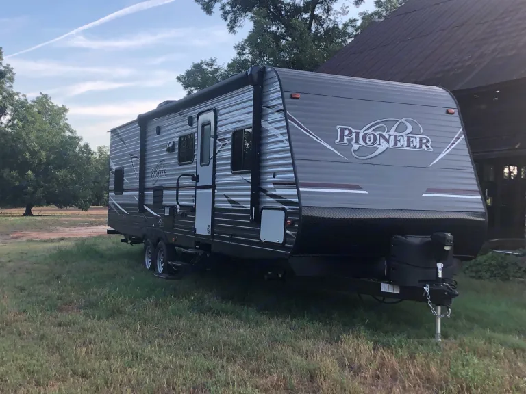 The Pine-Cone Palace is a 2019 Heartland Pioneer QB300Perfect for a weekend get away with kids or group of friends. This camper sleeps up to 8 people with a queen bed, a bunkroom with 4 twin size beds, dinette sleeper and a sleeper sofa. Kitchen includes gas stove, microwave, sink, fridge and freezer. Bathroom has a tub shower combo which is great for small children. (Towels and linens not included) Outdoor features include power awning, outdoor radio, luggage rack, and outdoor shower.We are not delivering at this time.I will happily answer any questions you have about the camper and amenities. Thank you for considering the Pine-Cone Palace for your next camping adventure.RecommendationsNeed at least a 3/4 ton truck to pull.
