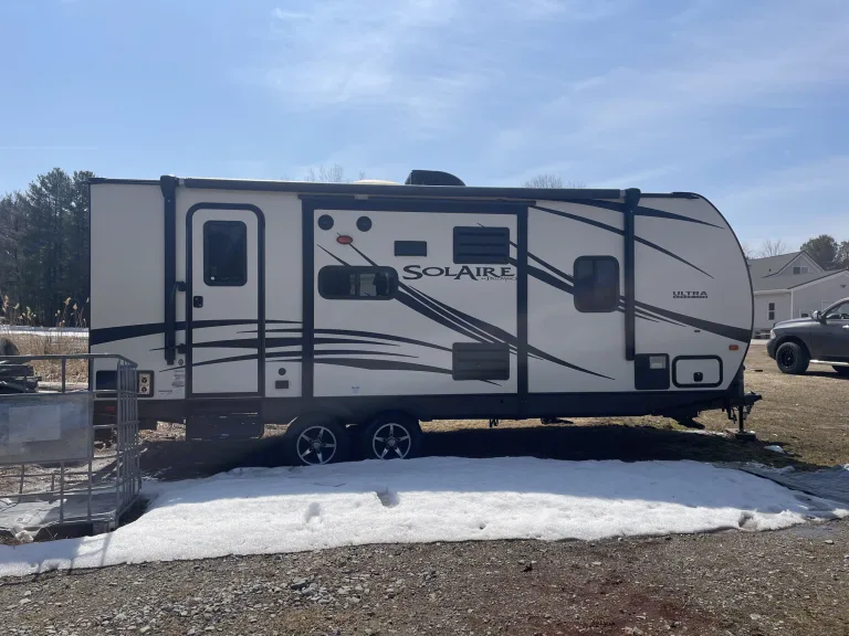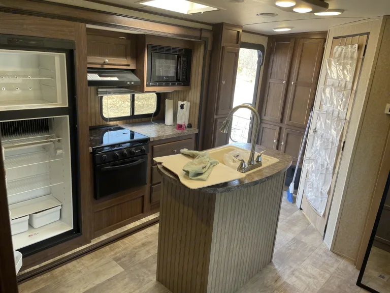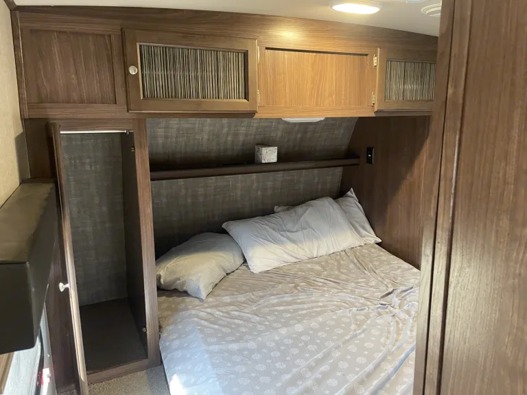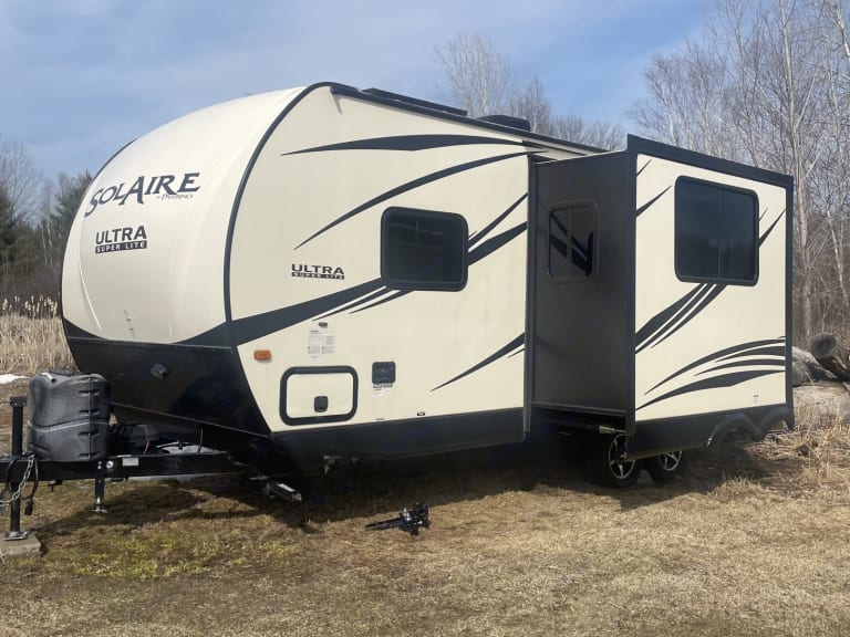 This travel trailer is perfect for that couples or individuals that love adventures with their furry companions.Our lovely trailer includes a swivel tv perfect for cuddling in the queen size bed & dinnette. A full size fridge and island sink is perfect for those looking for the ultimate glamping experience.Indoor & outdoor showers!What's includedFresh linens, coffee maker, skillet, and basic cooking utensils. Electrical cords, water, and dumping equipment provided.Request items such as small propane tank, chairs, campfire cooking items may be added with additional charge.RecommendationsPets welcomed, you are just responsible for any damage or cleaning that is necessary.No smoking in the RV. You risk forfeiting your entire deposit if you do so.The camper should be returned in the same shape it left in.A $50 cleaning fee will be deducted from the deposit if the camper requires excessive cleaning.Other things to noteAny weekday check ins may not be available until after 4 due to work schedule.