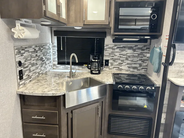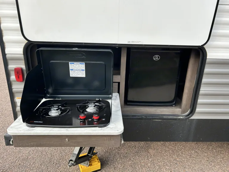 Outside of the camper includes an outdoor kitchen with two burner stovetop and mini fridge!The outdoor storage holds everything you need for setup and some extras like camping chairs for your convenience!