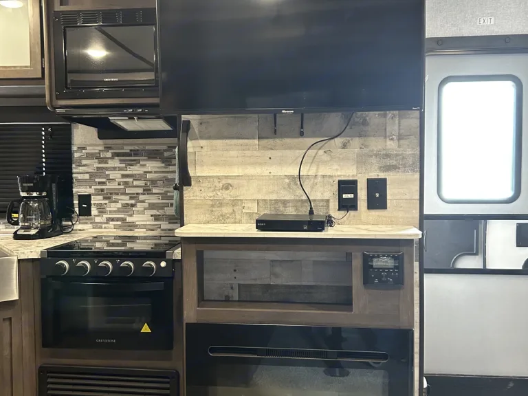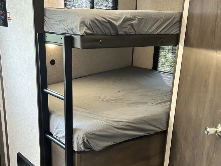 Double bunks provide a cozy space for your kids to sleep as well. Each bunk also has USB charging ports.The bathroom has shower, sink, toilet and cabinet for storing your toiletry items.