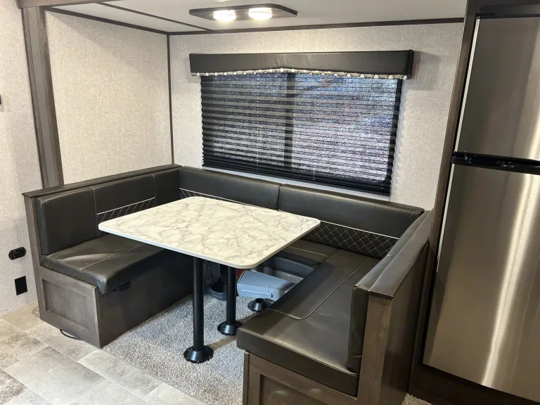 Welcome to your next family camping adventure in our fully loaded camper!Enter to the kitchen and living area with entertainment area with tv, dvd player, fireplace and Bluetooth speakers! Kitchen has a refrigerator for all your food, stove, oven, microwave, cooking equipment and dishes for cooking up your favorite camping meals. There is also a large pantry for storing dry goods and other bulk items you may have. The large dinette also converts to a bed. We have included dvd’s and card games for rainy day entertainment as well.The bedroom has a comfy RV queen bed, tv, dvd player and storage for your belongings. All bed linens included.