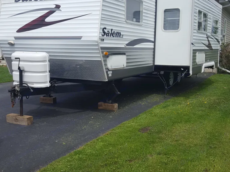 27 ft, sleeps 5 comfortably (bunk beds). sleeping 5 is without turning kitchen table into bed. Extra Large slide. Fridge, stove with oven, microwave and Kuerig. Washroom with shower.