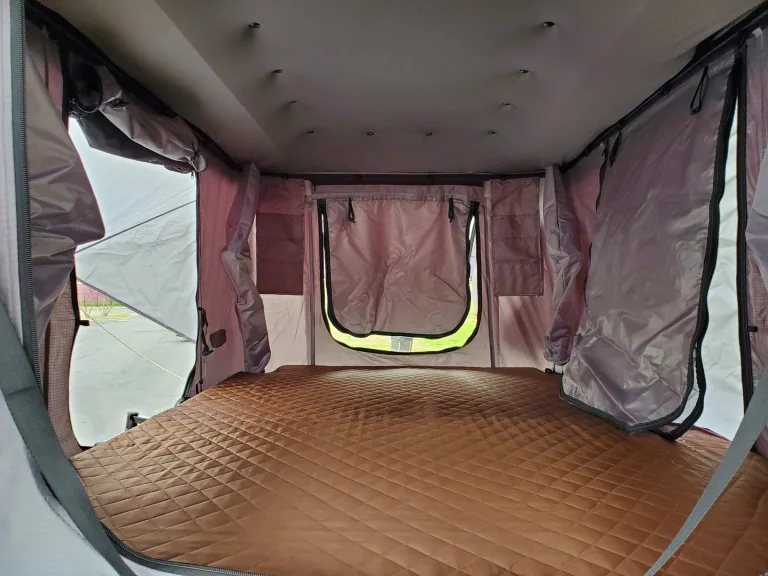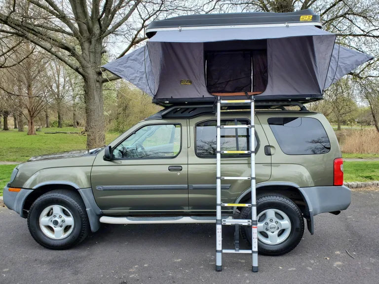 Roof Top Tent is the Smittybilt hard-shell model. It is 8Ft x 5Ft and sleeps 2 adults and 1 child comfortably. Very easy to setup and close. Includes 3 inch memory foam mattress. Xterra's rear seats fold down to allow for additional sleeping.