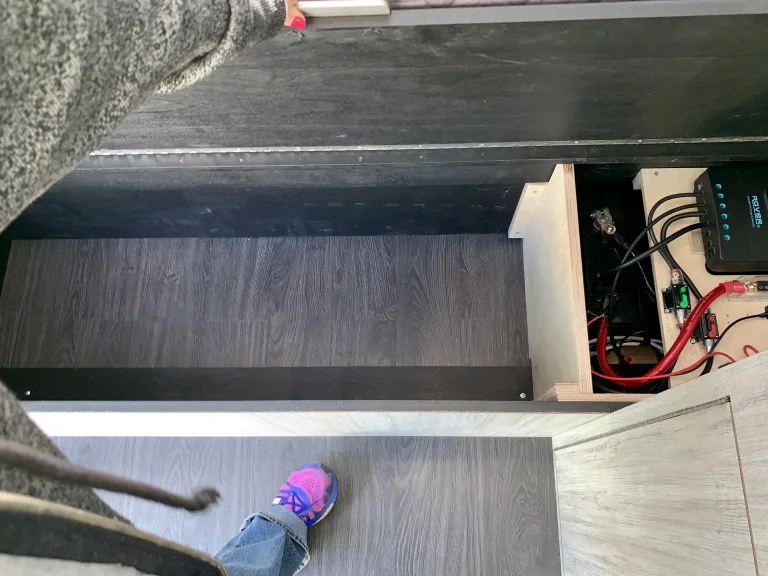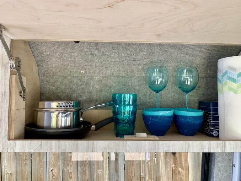 Kitchenette (solar powered; battery levels displayed above fridge):