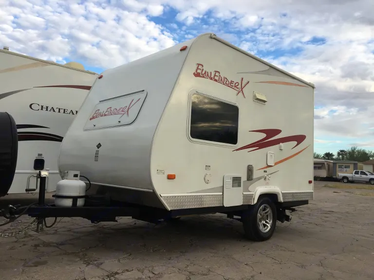All the same amenities as most larger travel trailers in this compact lightweight design. The Fun Finder is perfect for 1 - 2 people who want to get away for a solo trip, hunting trip, fishing trip or couples trip. This easy to tow travel trailer has a kitchen with a sink, two burner stove, Microwave and a convertible sleeper dinette. Above the dinette is bunkbed as well. The unit has a full restroom with toilet, sink and walk in shower. A/C & Heat and Awning