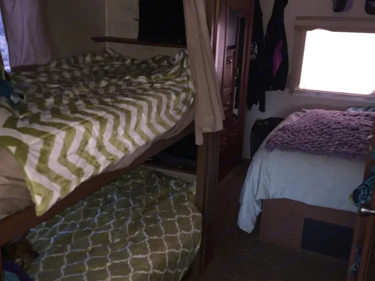Two slides. Sleeps 8. Bunks, queen master, sofa bed and table bed. Fully loaded and in excellent condition. Oven, microwave, 4 tv’s, Fully loaded and stocked. Super clean. No smoking.