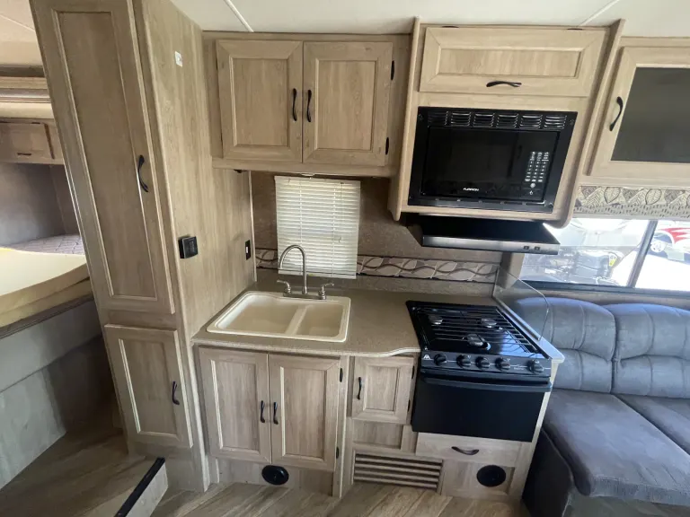 Sleeping space for up to eight, with an over cab bunk area, sofa sleeper, dinette converts to sleeping space and slide out walk around queen bed area.