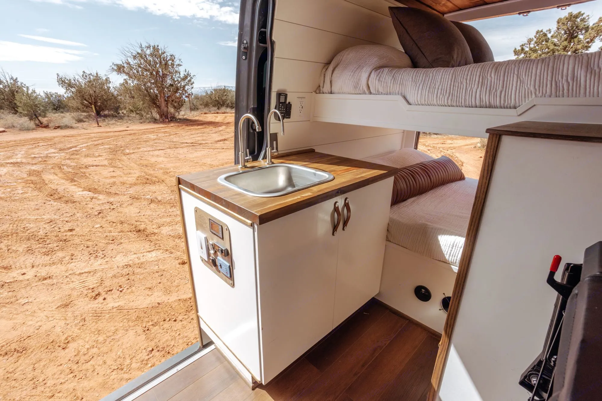 *Interior Amenities: Stainless Steel Sink, Water Filtration, Induction Stove (much safer than gas), Refrigerator, Canister toilet with potty tent, Maxx Air Fan, 12v Evaporative Cooler, Gas Powered Heat and Exterior Shower (Hot/Cold), 5 Duplex Outlets with USB-A & USB-C