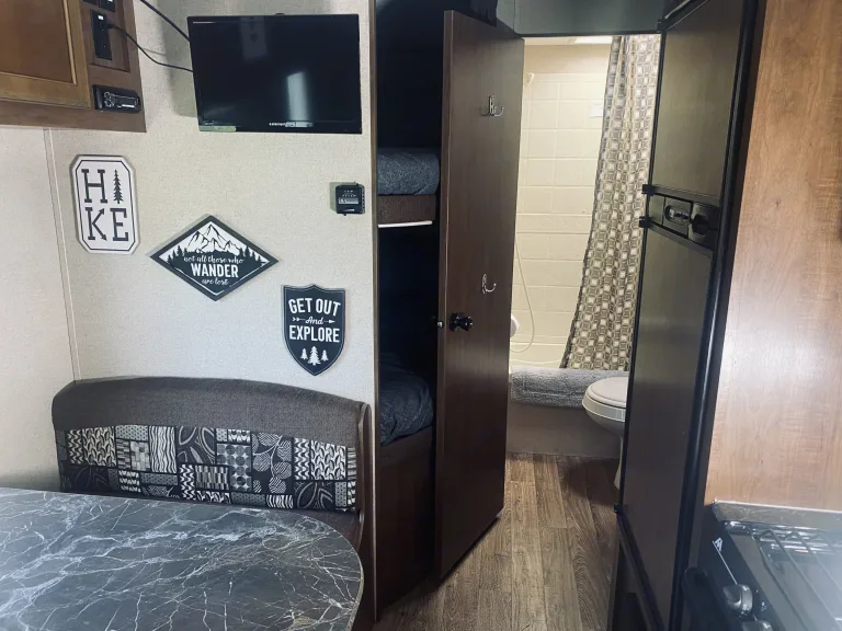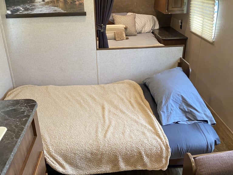 Electric awningLightweight, trailer with queen bed and two double bed bunkhouse. Sleeps 4 without having to convert table or couch. ( If you have smaller children, two will comfortably fit in each bunk bed.) Comes fully loaded with linens, dishes, silverware, coffee maker, cups, 4 rolls of toilet paper, camping chairs and outdoor rug. Two propane tanks provided.NO Smoking/Vaping - There will be a smoke smell removal fee. For future renters/families who do not want the smell of cigarettes/cigars/vape smoke (does not include campfire smell).Domestic travel only - No Mexico/CanadaIf you are camping with no power hookup, a generator is required for amenities: A/C, Microwave, coffee maker. The generator can run off propane or gas, recommend gas and additional fuel as needed based upon amenities needed. Generator will need to be in the tow vehicle, until at sight. Lock provided for generator. $25 daily fee for generator use.If towing and set up sounds too much of a hassle, allow us to pull up the trailer and set everything up for you. Delivery and set up fee $5/mile, with a minimum of $200.Any questions just ask, as we want to you to have a hassle free experience.