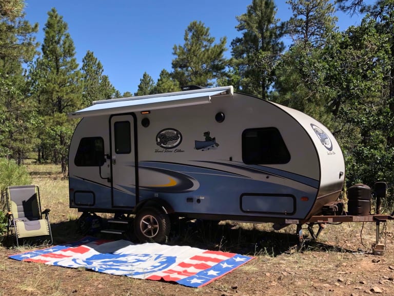 Easy to pull with light truck, Jeep, or SUV (less than 3000 lbs). Two double beds at each end. Full kitchen with microwave, one slide out, air condition and heater. Just Google search - 2019 R Pod 190 for full details. All modern amenities: Flat screen tv, blue tooth radio, USB ports, etc. Stocked with everything you need to go glamping: Out door table with two chairs, front patio mat (10’X15’),and 5 gallons of propane. Inside - two clean bath towels, clean floor mats, dish set w/ 4 plates/cups/bowls, silverware, can opener, and other utensils.
