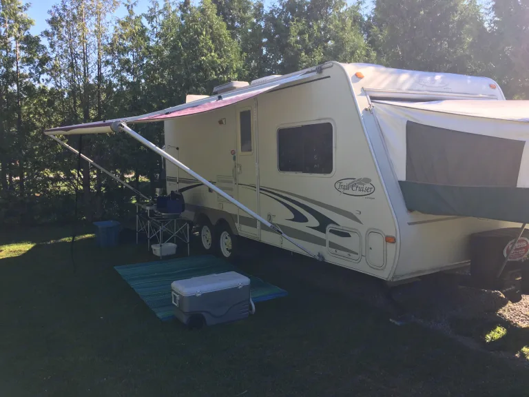 22 ft hybrid trailer with 1 Queen and one double tip out. Fold down couch and dining tent can sleep 7-8.Totally redone interior in 2016.