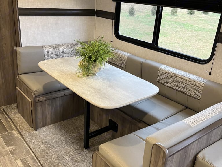 This nearly new camper was designed for memory making. With the ability to sleep up to 10 (6-8 most comfortably) you can have all your loved ones in one spot. The camper has one large super slide, a queen room and a bunk room with three bunks and a sofa bed in it. The kitchen is stocked with all the necessities to make you feel at home. There are three TV’s that come with the camper. One in the living room above the cozy fireplace, one in the bunk room above the dresser, and one you can use outside on a table under the awning. There are four lawn chairs, two of which are loungers in the storage compartment. Linens, blankets, towels and beach towels are provided. If you are like us and prefer spending as much time as possible outside, then the outdoor refrigerator and cook top will come in handy.