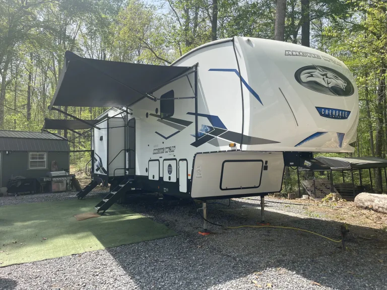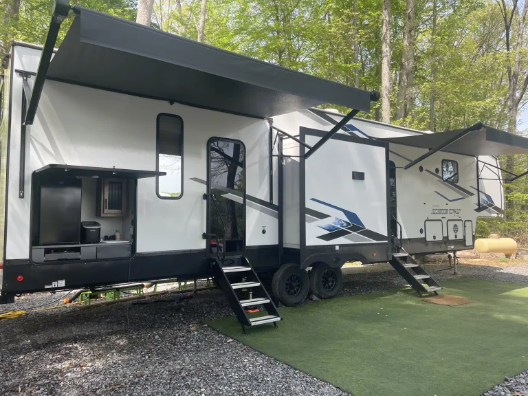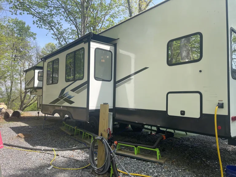 - Prep fee: $150.00. Full set up included: parked, stabilized, plugged in, septic set up, full propane, electricity connected, slides out, rug positioned, and camping chairs set up.