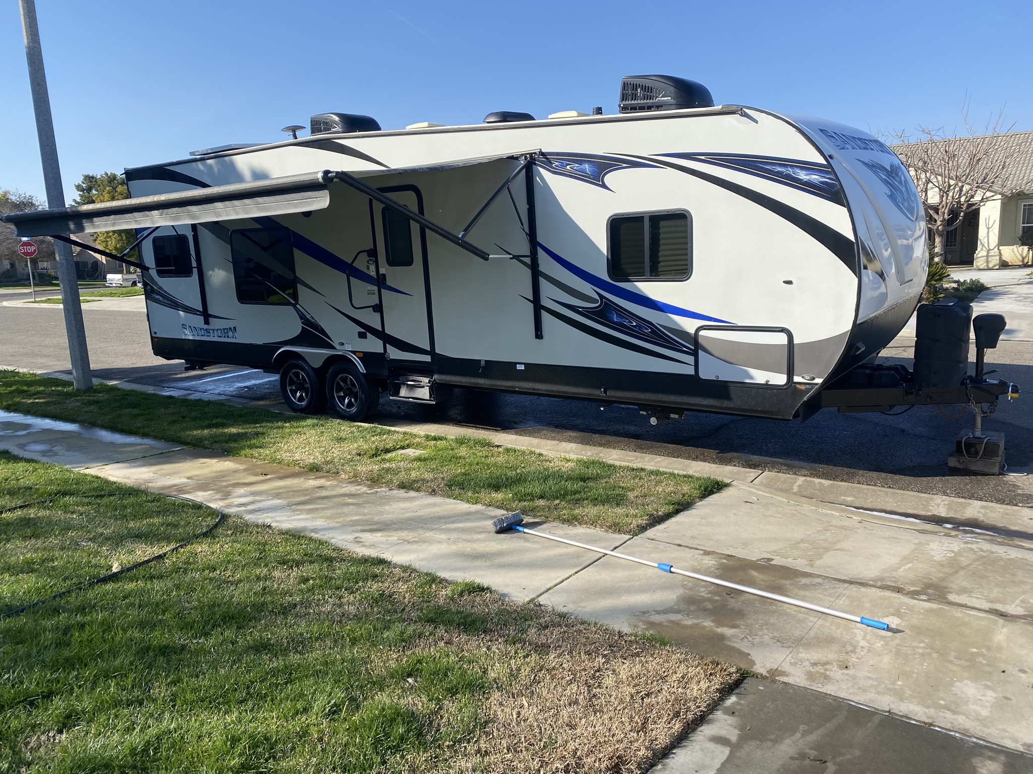 This 2018 Forest River Sandstorm Toy Hauler is the perfect addition to any trip! This unit is equipped with a queen size bed in the master, a sofa/bed combo as well as lift/lower bunk beds in the rear. This trailer also includes the following: A fully stocked kitchen equipt with cookware & utensils, an indoor shower/bathroom (towels provided), SmartTVs to stream your favorite shows, a generator, awning, heating/air conditioning unit, and a sound system to enjoy your favorite tunes. With plenty of space and storage - this rig is perfect for the ultimate vacation!What's includedDon't want to worry about hauling & set up - we've got you covered!