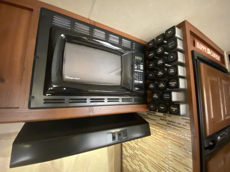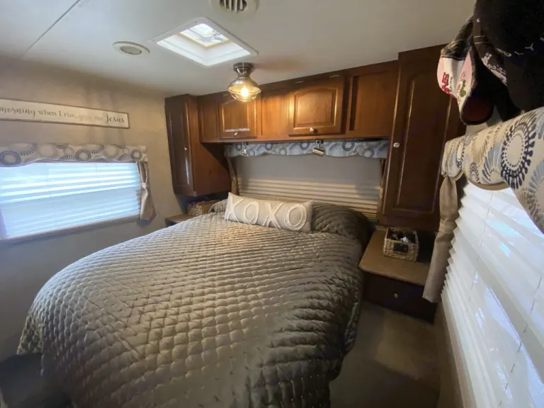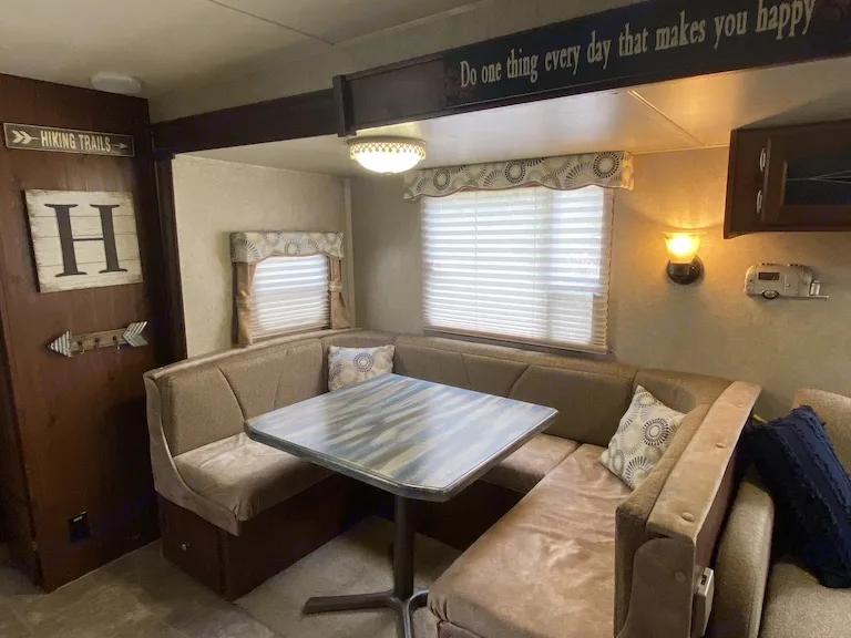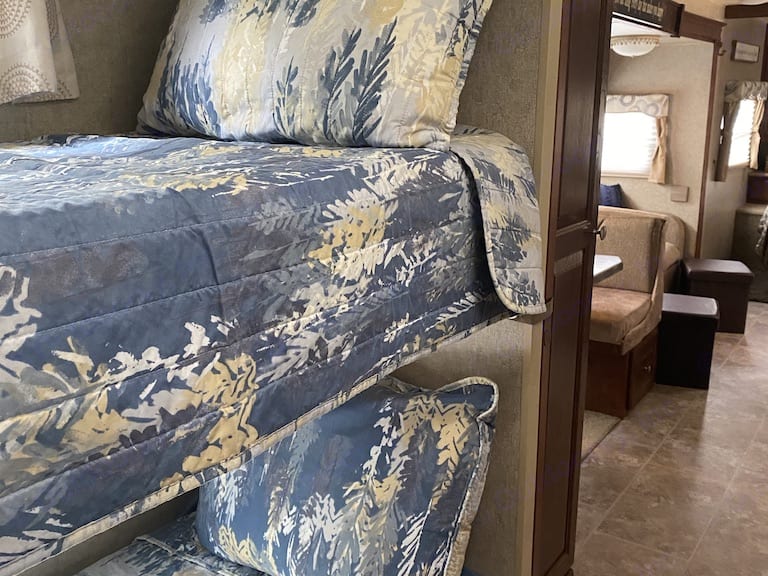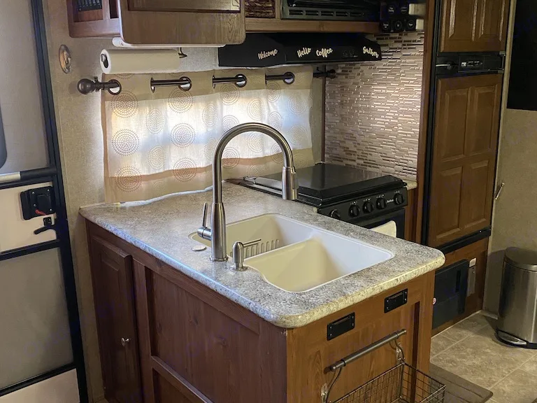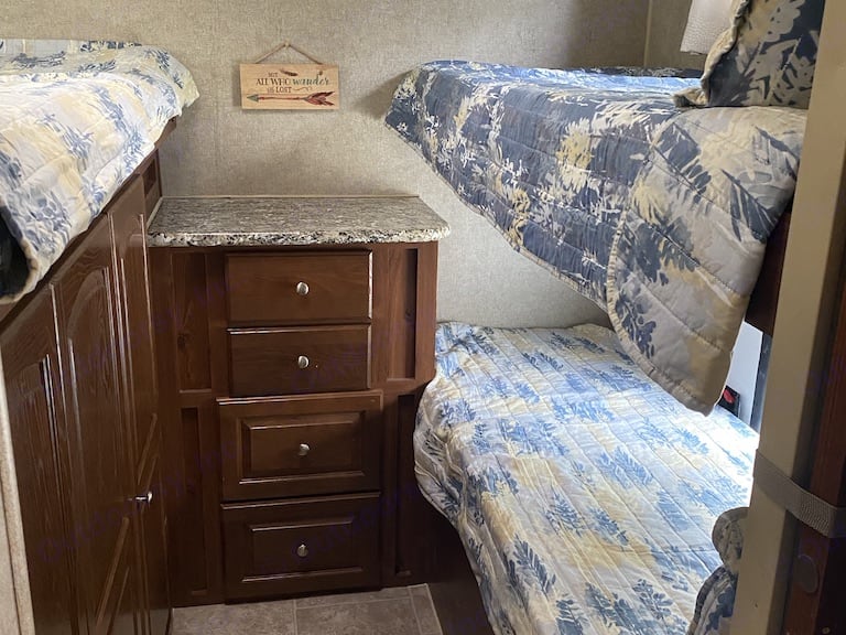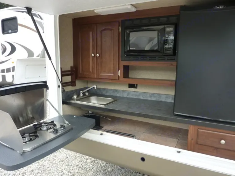 Outdoor Kitchen featuring sink, refrigerator, 2 burner stove and gas grill! Outdoor shower as well which is fabulous year-round! The fireplace adds ambiance and thermostatically controlled heat output. This unit is fully equipped and ready for you to make memories with your family and friends. It sleeps up to 7 people with 5 - 6 in permanent beds in 2 separate, private areas (bunk room in back, MBR in front both with closing lockable sliding doors) + 2 on the pull out sofa with air mattress. Private master bedroom with a super comfortable queen bed with plenty of storage and a flat-screen TV. The main living area features a sofa that converts to a full-size air mattress bed along with a blue tooth equipped radio with speakers throughout including outside & flat-screen TV. The table has plenty of seating to enjoy meals and games. Kitchen is fully appointed with a fridge/freezer, 3 burner gas stove, microwave oven, and a flush mount stone cast kitchen sink with upgraded pull-out faucet. There is a countertop extension as well and the rig is outfitted with a coffee maker, spices, cookware, cutlery, games, outdoor rugs, camp chairs, etc. The bathroom features a toilet, sink, shower/tub combo, under the sink and medicine cabinet storage. The second private area in the back features 3 bunk beds and a plethora of storage.