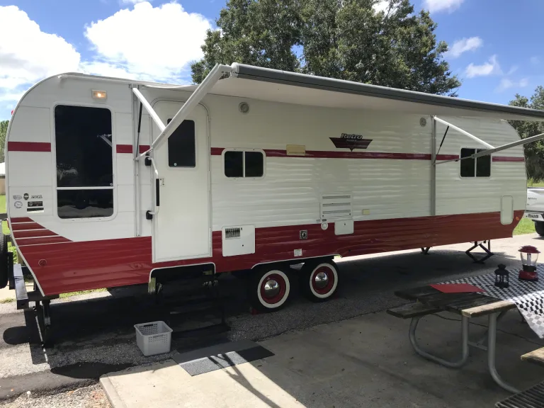 "The Rooster" is a 32 foot 2018 Riverside RV Whitewater trailer, with an awesome retro style but full modern amenities! She doesn't look like every other RV in the campground, with whitewall tires, a red and white exterior, black and white checkerboard floor, and light wood veneer on the walls and ceiling.