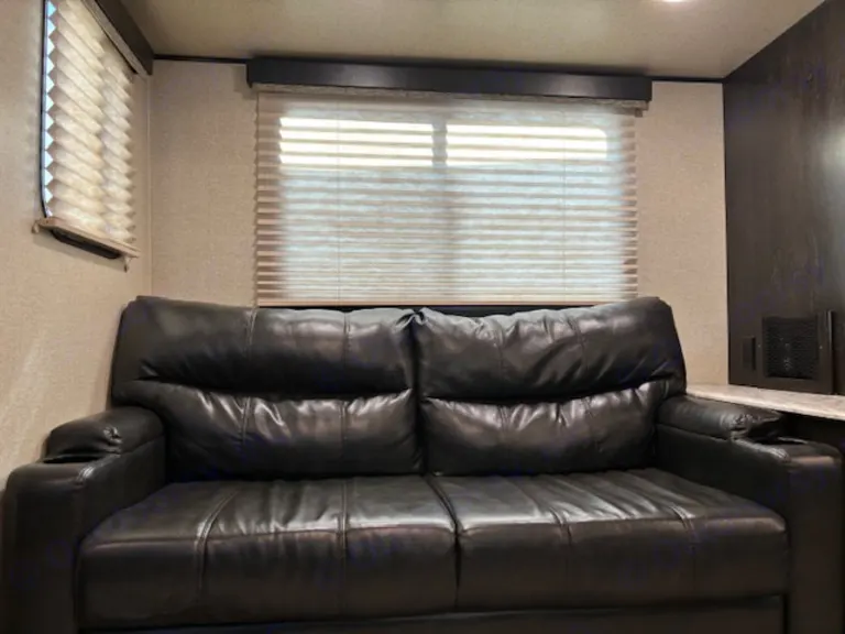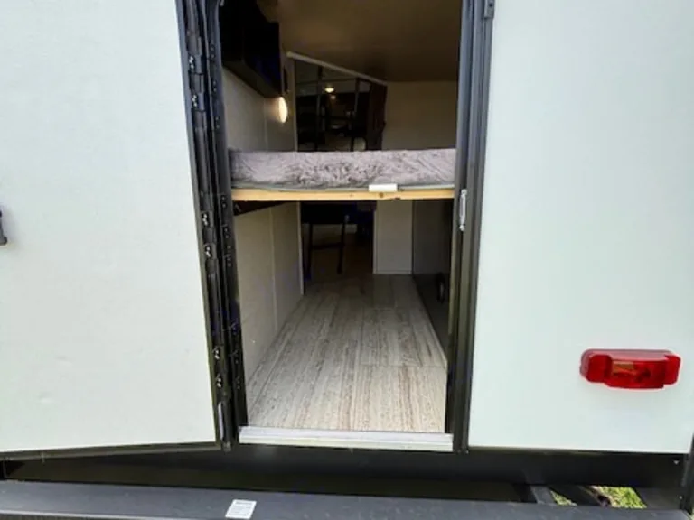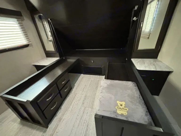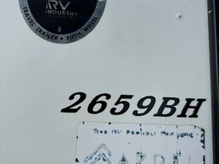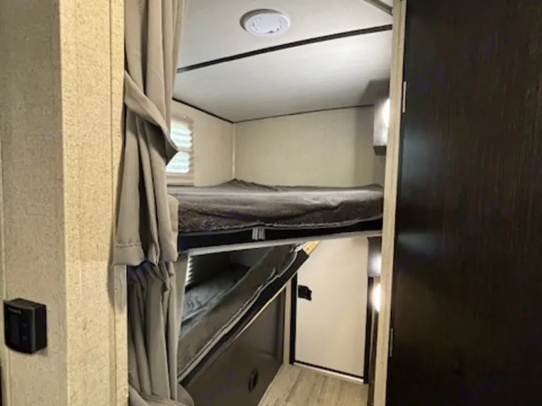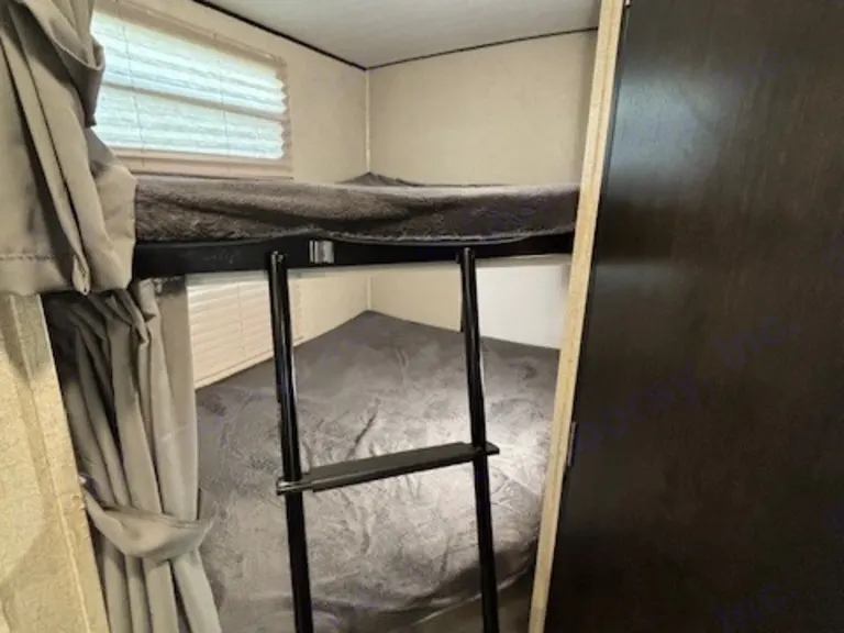 This is a great bunkhouse. Weighs 3218 Lbs., sleeps 6 to 8 and is 38' 9". Walk in the front door and you are the kitchen area with a 3 burner stove, microwave, Large frig and freezer, double sink and good counter space. Eat your meals at this unique High Top table and 4 stools. Keep heading toward the back and to your left is the entertainment center with 40" TV, AM, FM, CD, DVD, player and three storage closets under the TV. Across from the TV is a plus couch that can open into a double bed. Still heading toward the back and to your left is two double bunks with a ladder. The bottom bunk can lift up to allow for extra storage space and there is a door in the back that will let add bikes, smoker grills and such. On the other side of the bunks is the bathroom with a tub shower, toilet, vanity with sink, and medicine chest with mirror. Go to the very front and you find the front bedroom bedroom with a Queen bed and a hanging clothes closet on each side. Lift up the bottom of the bed and there is a storage area with 4 drawers on one side and storage space on the other side with a place with a cushion to sit down and finish dressing.