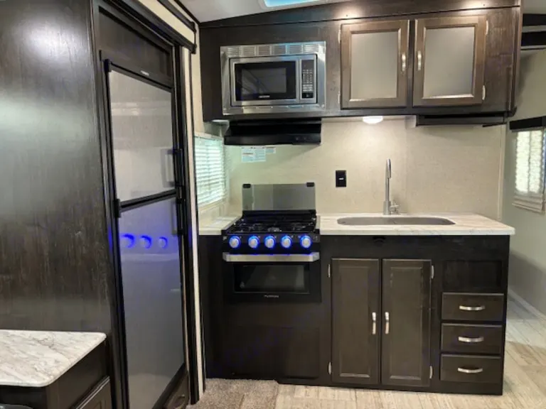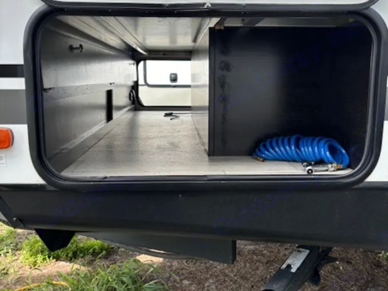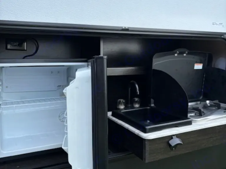 Outside there is an electric tongue jack, 18' awning with LED lights, and outside kitchen with hot and cold running water, mini frig., and two burner stove. All this is ready to go on your on your next adventure.