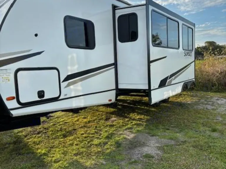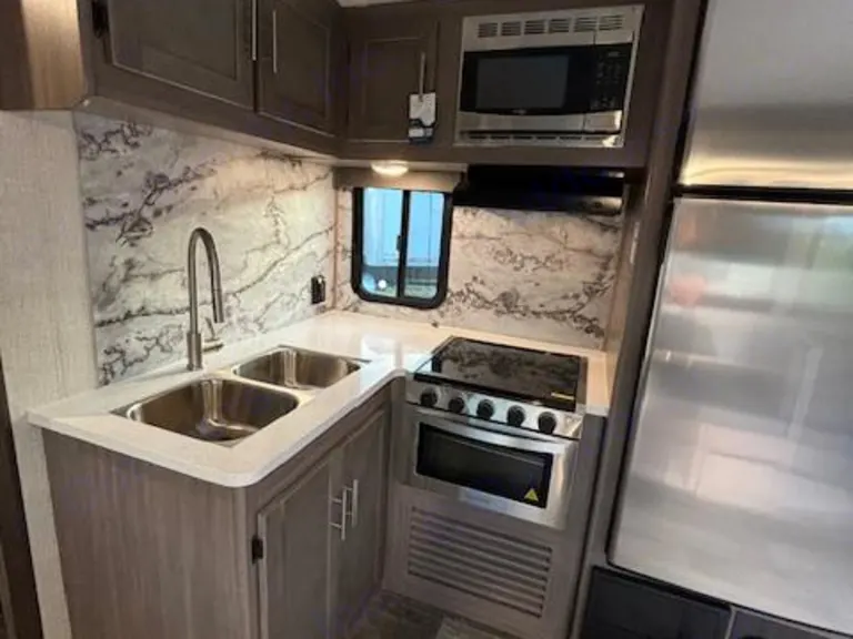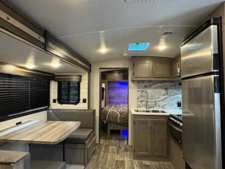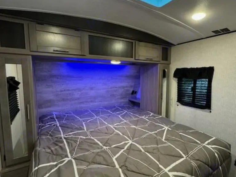 Outside there is a cook center towards the rear with a grill and a mini frig. There is an electric front hitch jack, electric stabilizer jacks, and Electric awning with LED Lights. All this and more ready for your next adventure.