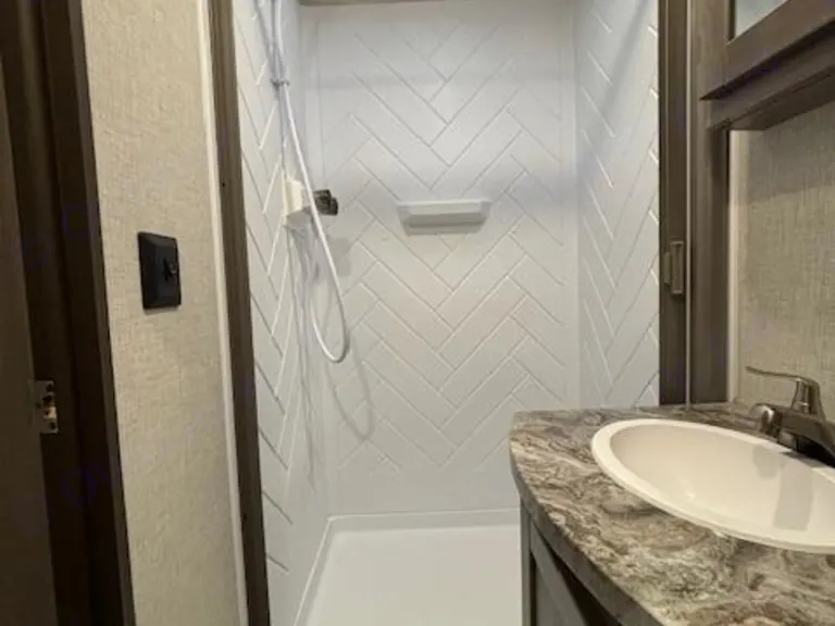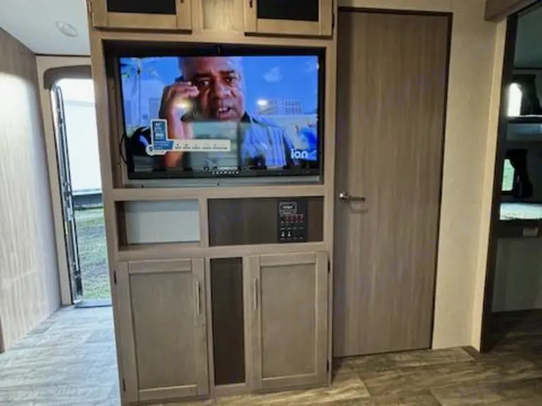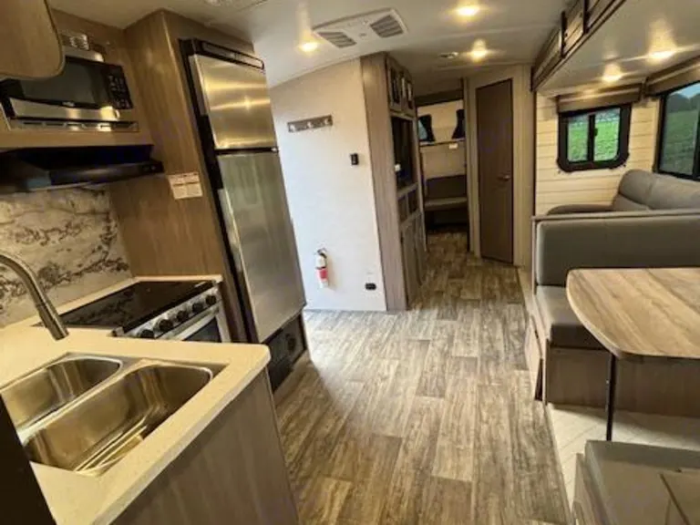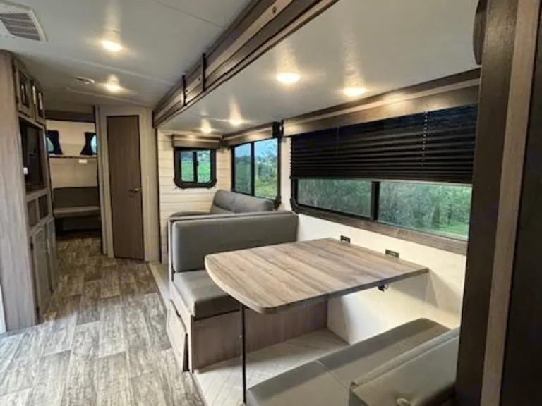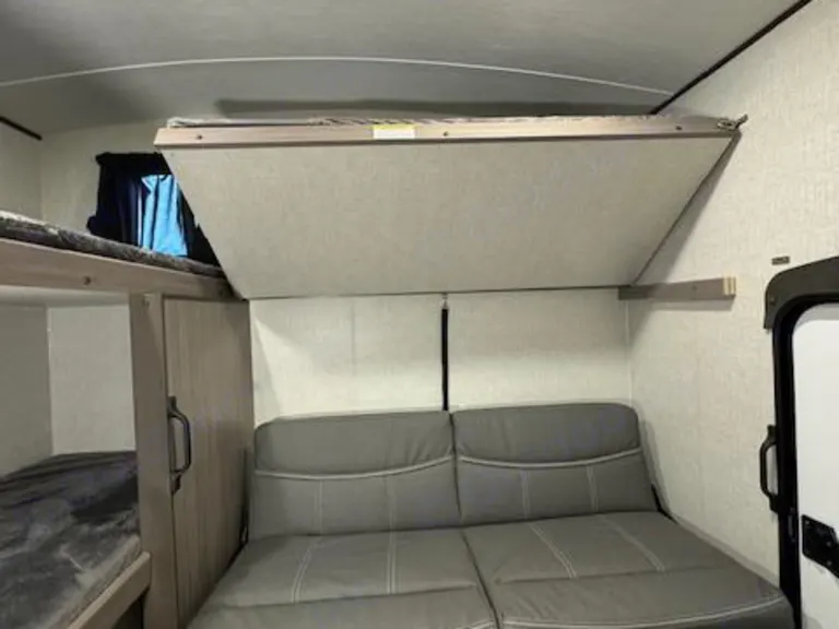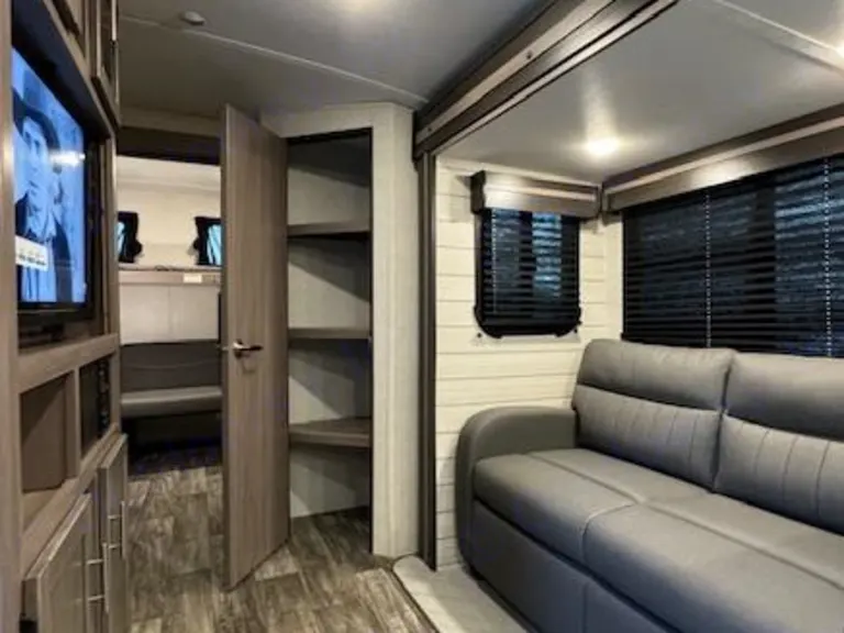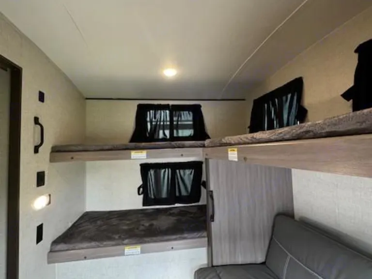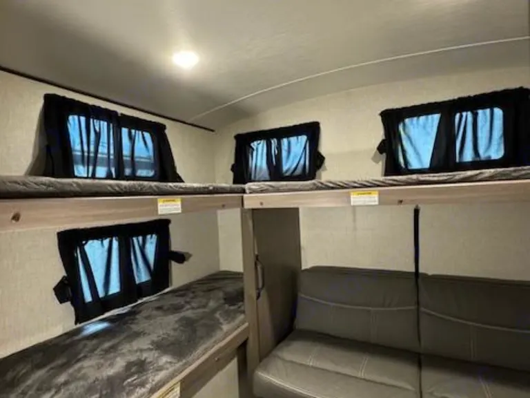 Enter through the front door and to your right is a full kitchen with a 3-burner gas stove, microwave, large frig. and freezer with plenty of cabinets and drawers for storage. Streight ahead is a large bench seat dinette across from the kitchen and next to the dinette is a Tri-Fold sofa that will open into a double bed. Right across from the sofa is a entertainment center with a 40" TV and AM, FM, radio with Bluetooth. Keep on heading to the back to your right is a pantry and to the left is a full bathroom with a 30"x 36" shower, toilet, vanity with sink, linen closet, and medicine cabinet. Still heading to the back is the bunkroom. There are 4 single bunks. The top bunk can lift up so the lower bunk can become a sofa when needed and fold down to a bed as needed. There is also a wardrobe storage closet and a half door that can pen from the outside so the open space in the bunkhouse can be used to bring bikes, or a grill and such. Go all the way up front and you will find a large bedroom with a King size bed and two wardrobe closets for hanging cloths.