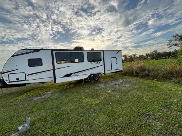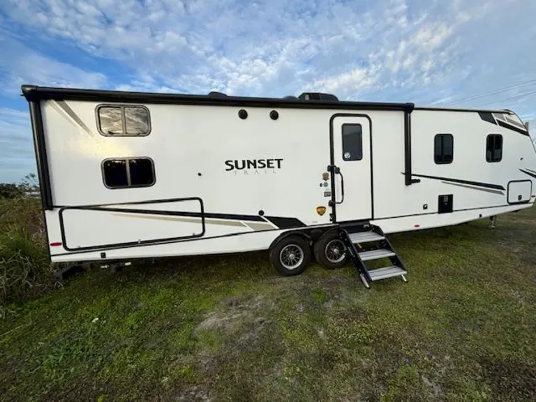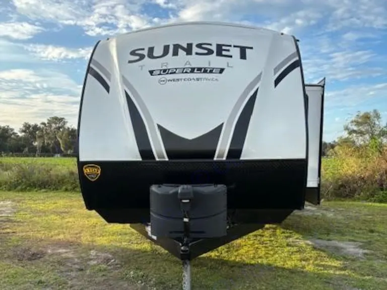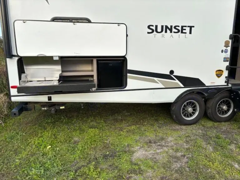 The Sunset Trail 299 QB weighs 6,230 lbs., sleeps 9, and is 33' 11" Long.
