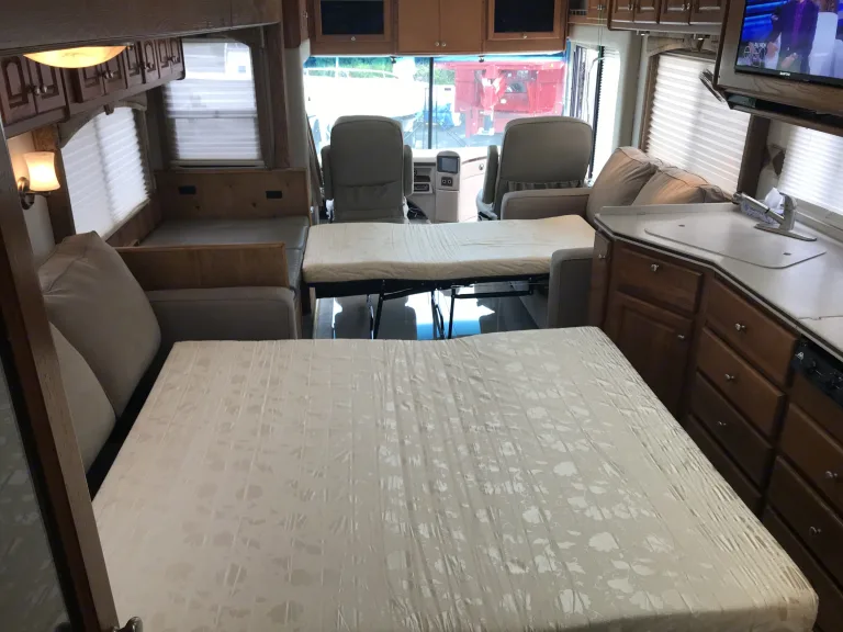 Yes this is the actual RV in the pictures. 40 Feet Rig Diesel Pusher. A very clean, well kept gem. We take pride in keeping the Escaper in tip top shape and completely stocked. With our work and lifestyle I like to keep the Escaper loaded with everything from pots, pans, dishes, linens. We always keep it with a full tank of Diesel fuel ready to go at a moments notice. If you can think of something that may make a trip easier or more enjoyable we will more than likely add it to the rig. I am more than happy to work with anyone no matter the knowledge and do everything to make renting as smooth and enjoyable as possible. It has a Hdtv flat screen in the main living area, dvd player, movies streamer and another one Hdtv flat screen in the bedroom. Netflix movies available also. Has a queen mattress, a pull out couch with a standard mattress and there is a memory foam queen mattress on the pull out sofa as well, there is another couch that open to a bed and can sleep two children. It does have Washer and Dryer.