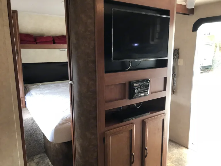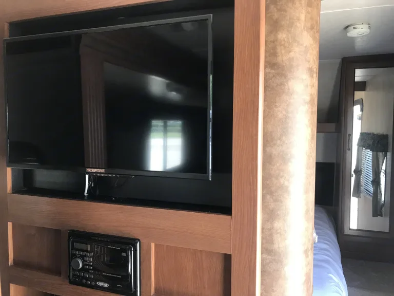 Yes this is the actual Travel Trailer in the pictures. This is the Luxury Version. It has Dual Backup Camera set. Everything is electric and controlled by remote control. It can setup in 3 minutes. Is is a very clean, well kept gem. We take pride in keeping the Salem in tip top shape and completely stocked. With our work and lifestyle we like to keep the Salem loaded with everything from pots, pans, dishes, linens. It is ready to go at a moments notice. If you can think of something that may make a trip easier or more enjoyable we will more than likely add it to the the trailer. I am more than happy to work with anyone no matter the knowledge and do everything to make renting as smooth and enjoyable as possible. It has Two 32" Hdtv flat screen TV's in the main living area and bedroom, dvd player streamer. Netflix movies available also. Led lighting everywhere. Has a queen mattress, dinette folds down triple bank beds and couch.
