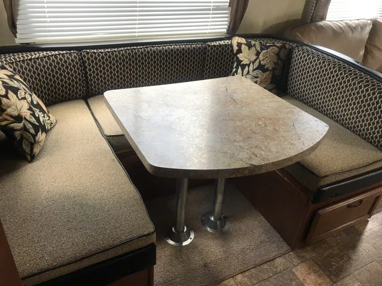 It can sleep 9 adults and there is enough space for air mattress for another 2 people which I provide. It has one huge slide out.