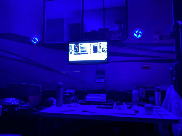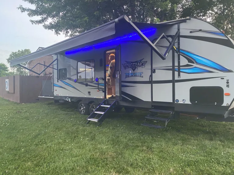 Fuzz is a 2019 Forest River Vengeance Rogue Toy Hauler complete with a fuel station and built in generator. It has an awesome party deck, queen size bed with aftermarket Premium mattress, comes with 2-large cots that hold up to 350lbs ea, custom cabinets, 2 fold down tables, pantry, extra lighting, stereo/radio/bluetooth, full kitchen with convection oven/grill/microwave combo, coffee maker, stove, refrigerator & freezer, ventilation/vents for gas fumes to escape while traveling from ATV, cold A/C, and heater. Tons of storage space underneath for all of your gear!This rig is also equipped with its own fuel station, tie down hooks built in the floor to secure ATV's, out-door shower, built-in generator, exterior speakers, blue lighting (hence the term "fuzz" for cop), USB plugins, full bathroom with large shower, full length awning, 2 separate entries into the travel trailer for privacy, and a removable tv that can be placed on the side of the trailer for watching the game outdoors or for a movie night.
