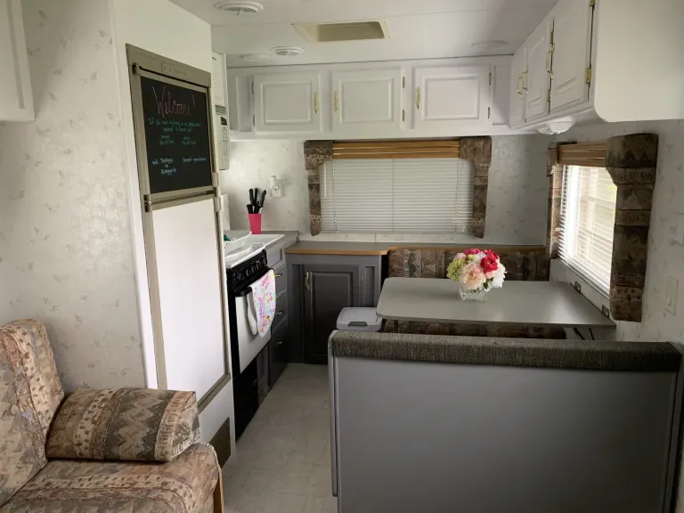 Super clean 2000 Skyline Aljo bumper pull travel trailer in great shape. This is the perfect companion for your next camping trip! Length of the trailer is 27' and easy to pull. Very clean interior, comfortable queen size bed with convertible couch and dining set to sleep a total of 6 people. The master bedroom is to the rear of the trailer and is separated from the rest of the living space by the bathroom. The bathroom is large with the toilet and sink on one side of the trailer and the shower/tub on the other side. The kitchen is at the front of the trailer and separate from the living space. One of the kitchen benches detaches and swings around to face the living room for additional seating while you relax in the living room. The kitchen is stocked with everything you need for your camping dining experiences. You'll find the gas and water tanks ready to go and we provide clean bedding, blankets, towels, and sleeping bags (4 adult size and 1 toddler size). Lots of storage. All you need to bring are clothes and food!Everything works great. New tires, new batteries, air conditioner (works on electricity hookup only), heater (works with LP gas), microwave oven (works on electricity hookup only), dual power fridge freezer (works on electricity hookup or LP gas), stove & oven (works on LP gas), dual power water heater (works on electricity hookup or LP gas), auxiliary shower, manual awning. You'll be glad you made this trailer your camping buddy!ADD-ON Fees: