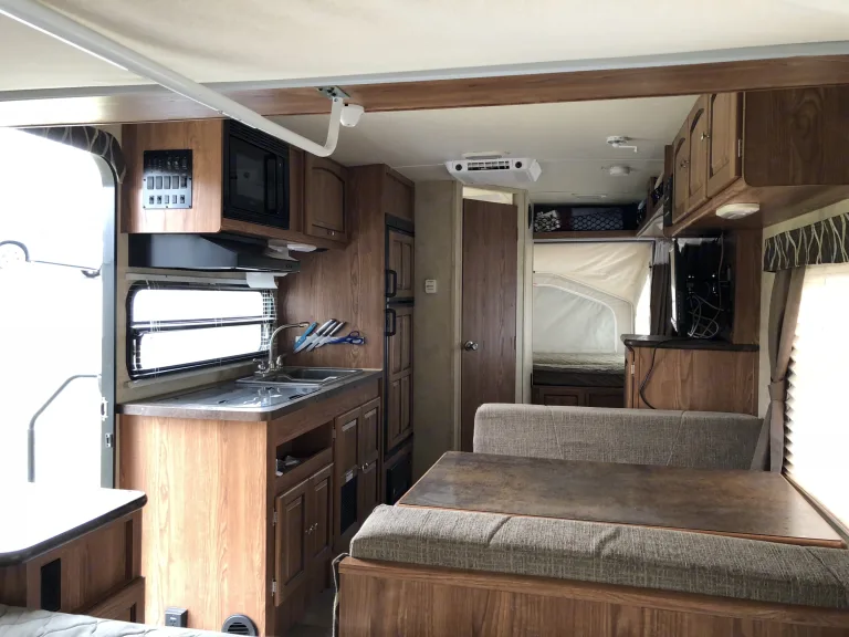 18 foot ultralight. 3 pop outs, sleeps 8 comfortably. AC unit, furnace, microwave, refrigerator, 2 propane tanks, electric tongue jack, full bathroom. Indoor and outdoor shower. 24” TV with DVD/CD player. Very easy to tow due to the light weight of the trailer. Must have trailer brake control. Great camping trailer in like new condition.