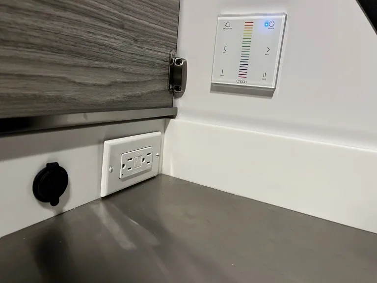 For tech-heads that need to keep their devices charged and entertaining, the interior of the cabin has 3 USB stations, a 12v, and wall plugs with more outlets in the galley. (Trailer must be plugged in to use the wall plugs.) The galley is equipped with stainless steel countertops, ample storage that can be accessed from within the cabin, two 7-gallon water tubs, propane stove, removeable washbowl, and a roomy cooler.