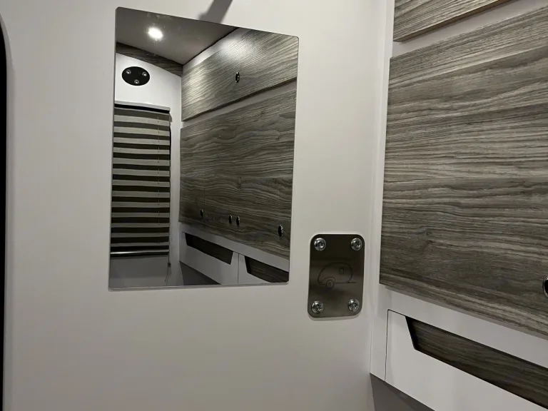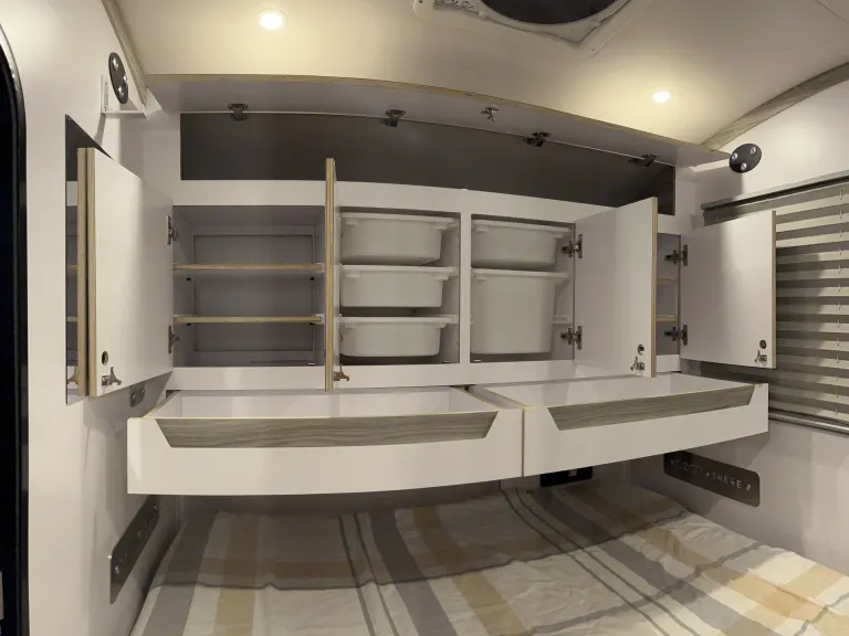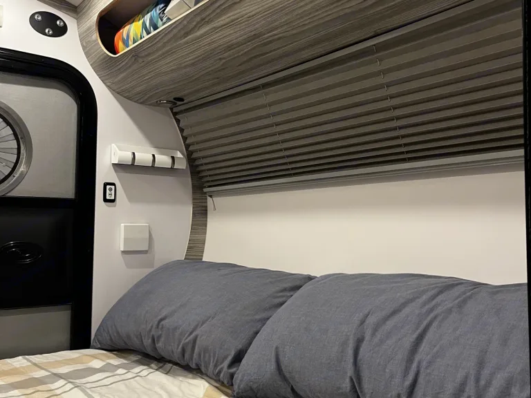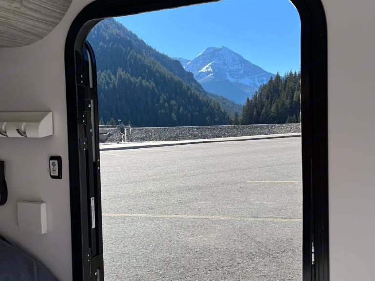 Features that we love are the screen doors for a great cross breeze while keeping out unwanted guests, the rooftop fan, the 180 degree awning that has withstood strong winds and hot sun, a stealth window in the front where you can enjoy the morning sunrise without going out or anyone seeing in, and a hidden table and with the mattress converted couch setup where you can enjoy a panoramic view from the front window. We have cross bars located on top that can accommodate a tent set up, clam shell for additional storage, or most rack brands to bring mountain bikes, kayaks etc. with you!
