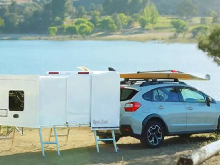 The Hitch Hotel is the “World’s First Expandable Wheel-less Trailer." This amazing travel trailer can work with any vehicle with a Class 3 trailer hitch and can go just about anywhere! You can transport all your camping needs when traveling and then provides over 135 cubic feet of sleeping space-big enough for for two adults to sleep comfortably,Great features: