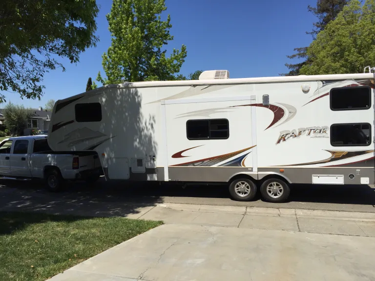 2008 Keystone Raptor 30 foot-5th wheel Toy Hauler. It's "so cool" because it hauls your off road or on road motorcycles, atv's, quads etc. For you "dry campers" it has an onboard generator, fuel station and sleeps 6 comfortabally. Living room slide out and garage that has to queen size bunks.