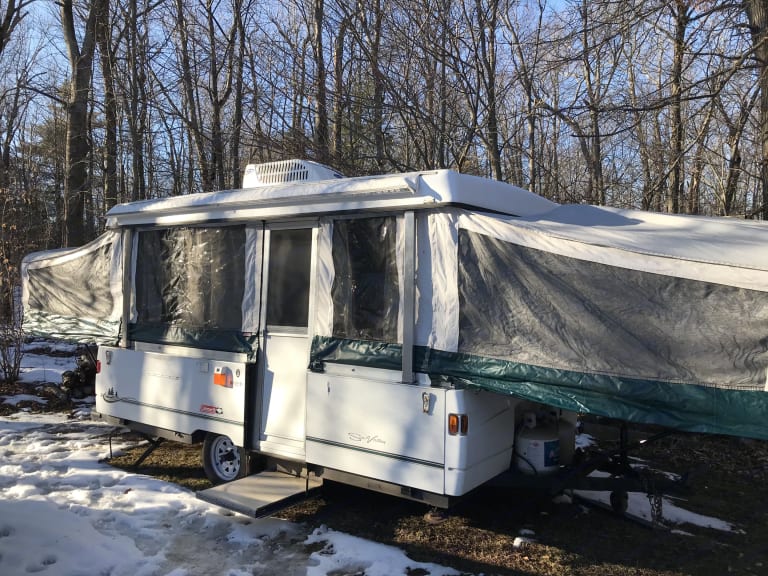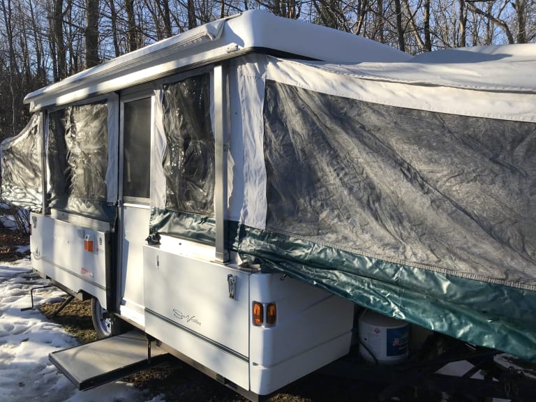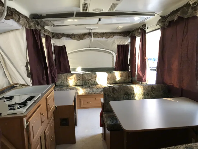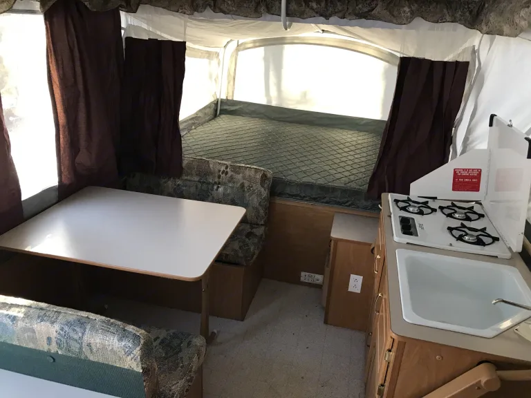 Get outside and enjoy! Camping in a Pop-up is the best of both worlds. You can enjoy the fresh air of tent camping but you have the benefit and security of getting off the ground to sleep. This camper offers a front king bed a back king bed, a dinning table that converts to a third bed and a couch that can also fold into a bed. The camper has lights inside and an outside light, heat, air conditioning, sink with running water, and a three burner gas stove.