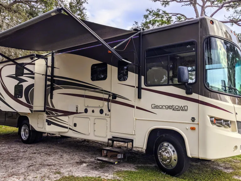 This RV has it all - Great comfort for pickup or delivery! 100% 5 star rating on all systems! I provide clean towels and linens hotel style!2 Full bathrooms with showers, King Bed, 2 Bunkbeds, Two new electric recliners that rotate flat, double bed dining conversion, large drop down bed above the drivers cabin and 5 TV's. 3 slide outs and large integrated generator. Also included is an Hdtv antenna, 4 DVD Players and the main TV is equipped with a Google TV dongle. The RV itself has extremely low miles and is like new(less than 20,000 at the time of this writing). Fully automated leveling system included and full tire pressure monitors.The kitchen features stainless steel appliances including a residential refrigerator with ice maker and water dispenser, three burner stove with oven, convection dual mode microwave with exhaust fan, dual sinks, and Corian countertops. Cookware, K Cup coffee maker are also included along with some plates, cups, bowls, and utensils. The ice maker can run even while you are driving. RV also comes equipped with a nice washer/dryer Combo!Both driver and passenger seats can swivel around for extra seating while parked. Lots of storage throughout the RV, including under the dining seats, under the master bed and in the outside bays. Soap, Shampoo and basic essentials are also included. Master bath has additional storage closet and draws while the bedroom has a ton of draws and closet space. Retractable outside awning with LED lights. Outside electrical connections. Connects to 50amp or 30amp via an adapter. High capacity water and waste tanks are heated.I've also written a special easy to understand RV guide about This RV that answers basically any question you can think of.Included for free upon request: