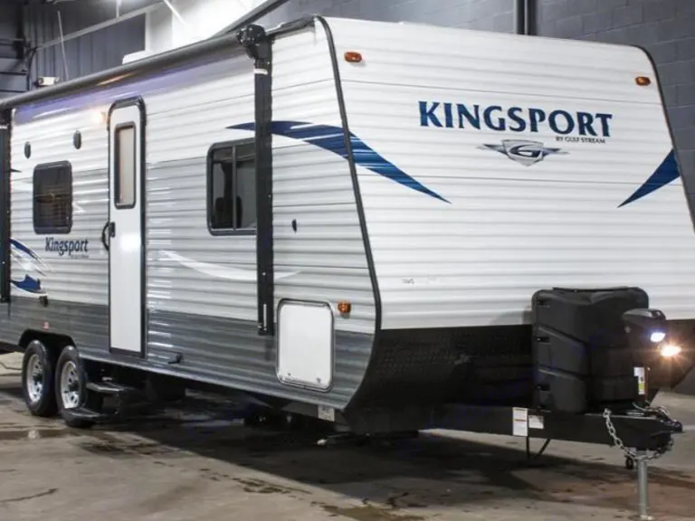 2017 Gulfstream Kingsport camper with bunk beds, blue tooth/CD audio, outdoor awning with LED lights, and Master bedroom with a privacy door.