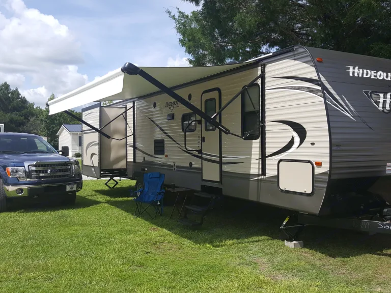 31ft travel trailer sleeps 6 comfortably. Main queen bed up front and 4 stacked singles in back. full kitchen stove and microwave, refrigerator, AC and heat, Tank-less water heater with digital adjustable temperature , outdoor kitchen and outdoor speakers, awning, essential kitchen and grill items, attached outdoor stove, mini fridge.