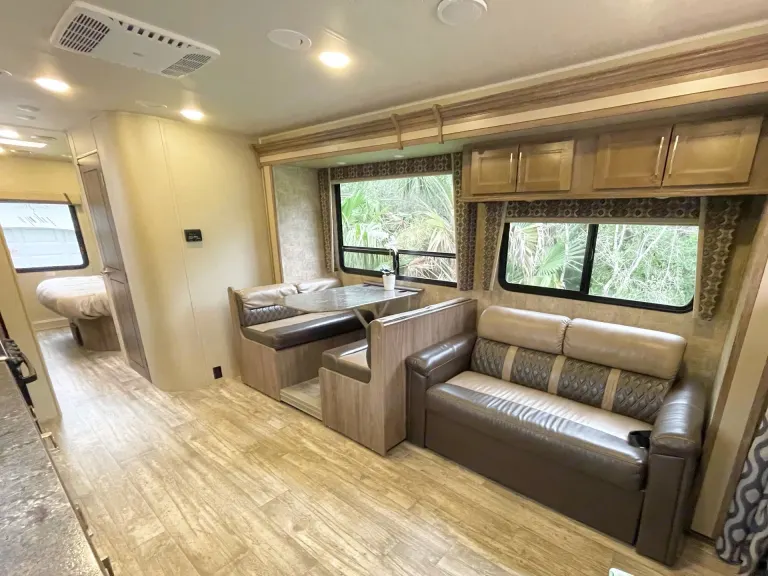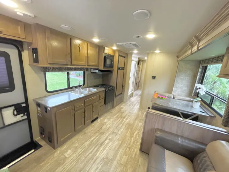 - Two slides for extra space, allowing access to the back bedroom during travel.