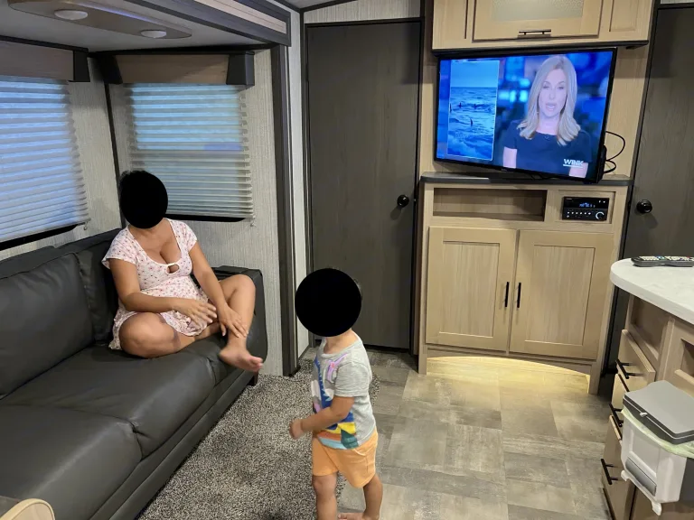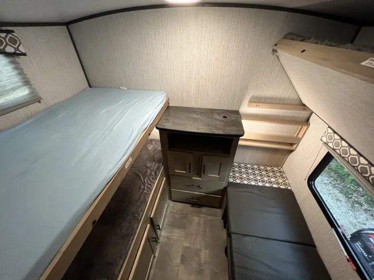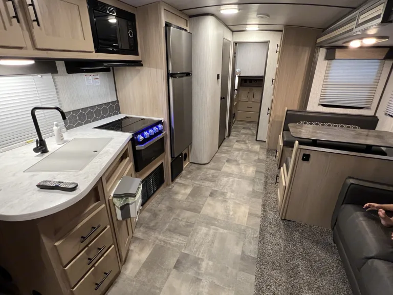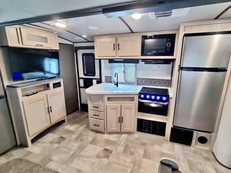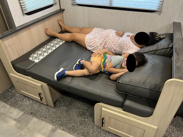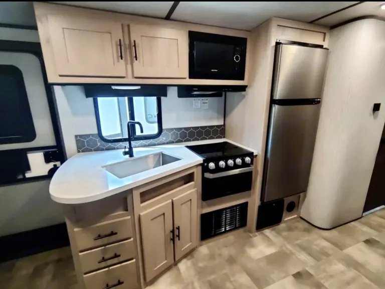 Sleeps 9 if the dinette table is folded down. Has an outdoor kitchen with a refrigerator, grill, water, and sink. Our camper is filled with amenities to make your stay comfortable.This camper is delivery only.