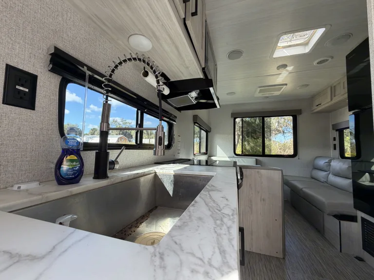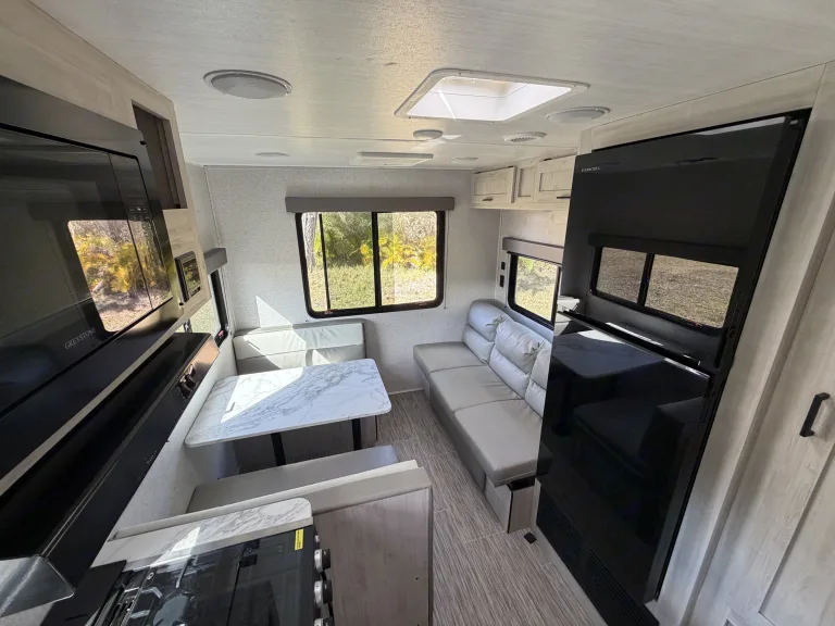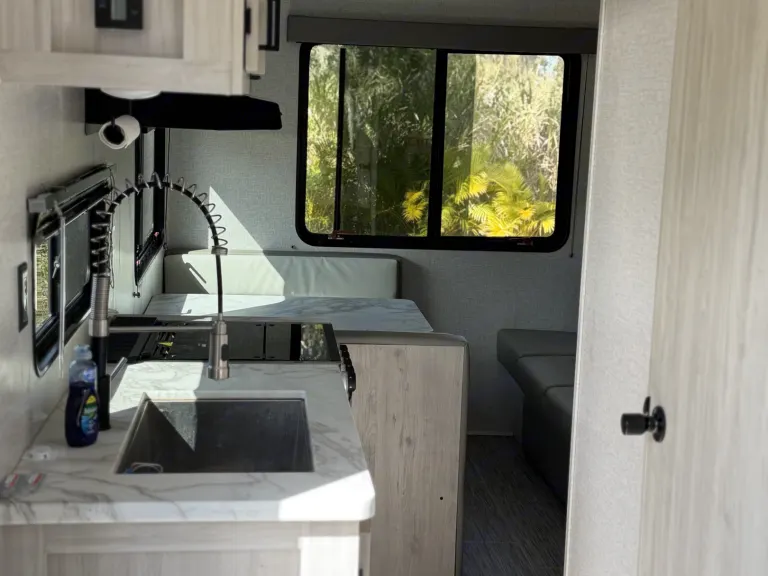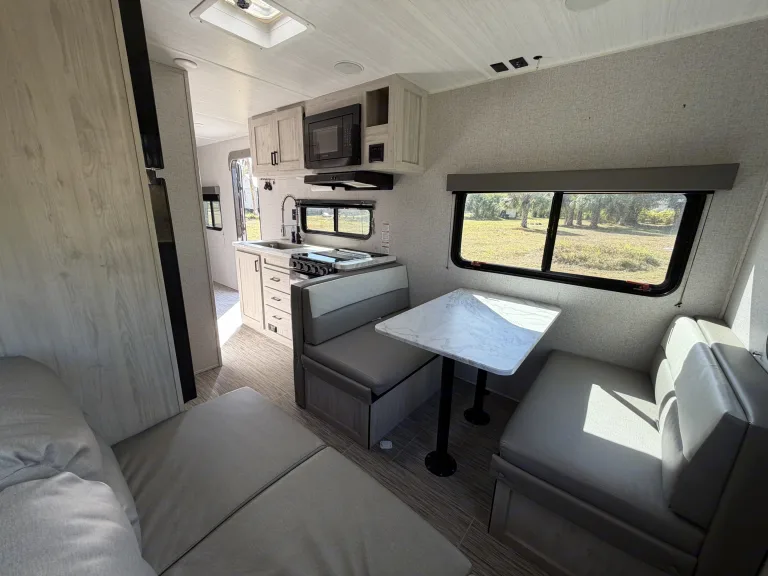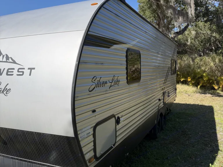 Experience the ultimate blend of modern luxury and nature.Our 2023 East to West Silver Lake 20KRD is a bright, airy sanctuary designed for those who don’t want to sacrifice style for adventure. The centerpiece of this unit is the massive panoramic rear window, which fills the living area with natural light and offers an incredible view of your surroundings—perfect for watching the sunrise from the comfort of your kitchen.Why this is a must-rent:The View: A unique "Rear Kitchen" layout with a floor-to-ceiling view that makes the interior feel massive.Sleep in Comfort: Features a private Queen-size bed with premium linens and enough convertible space to sleep up to 5 adults comfortably.Adventure Included: We provide a Free Paddleboard so you can hit the local springs or the Gulf Coast without extra rental fees.Gourmet Setup: Fully equipped kitchen with expansive counters and a large pantry for long-haul trips.Whether you are heading to the springs or the beach, this RV offers an elegant, "hotel-on-wheels" experience that turns heads at every campsite. What's included• Adventure Gear: 1 Paddleboard, 2 premium camping chairs, and a compact folding BBQ grill.• Luxury Bedding: High-thread-count linens and plush pillows for the Queen bed.• Fully Stocked Kitchen: Cookware, utensils, plates, and wine glasses for elegant dinners.• The Basics: Coffee, tea, and eco-friendly cleaning supplies provided.RecommendationsWaterfront Wonders: With the included paddleboard, we highly recommend heading to any of Florida’s crystal-clear springs or beachside state parks. The Silver Lake's rear window is a game-changer when backed up to the water—you can enjoy the scenery from the comfort of the AC or the dinette. It’s the ultimate way to experience the Gulf Coast or the hidden gems.