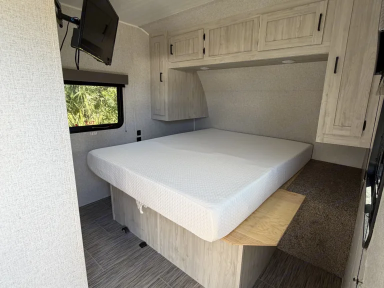 Modern RV rental bedroom with a comfy white mattress, light wood cabinetry, wall-mounted TV, window, and ceiling details.. East to West Silver Lake 2023